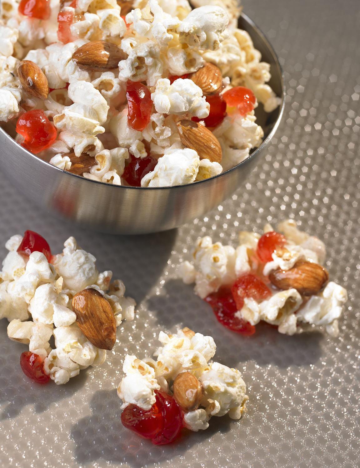 Keep popcorn warm in a 300-degree Fahrenheit oven. In a heavy medium-sized saucepan, combine sugar, water, corn syrup, vinegar, and salt. Bring to a boil; clip candy thermometer to pan. Cook syrup to 250 degrees (hard ball stage). Stir in almond extract. Scatter cherries and almonds over the popcorn. Slowly pour syrup over all, toss lightly to coat evenly. Spread popcorn on buttered cookie sheet. Cool. Separate into cluster with a fork.